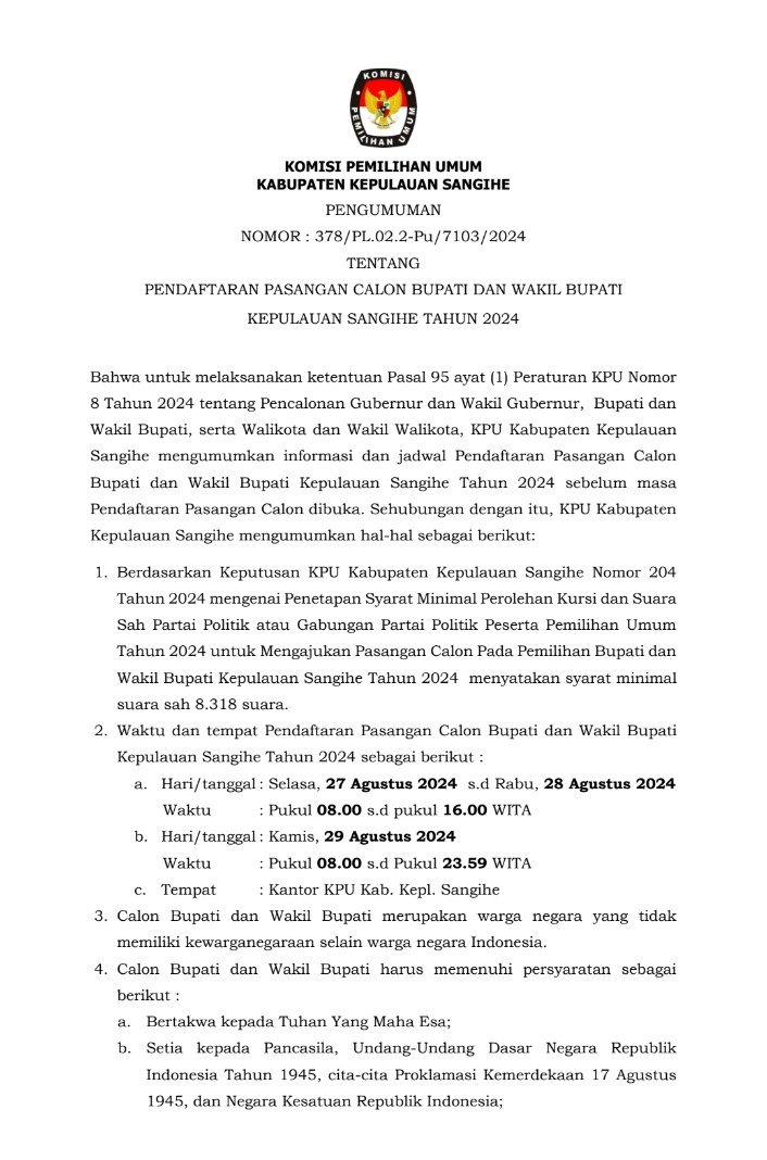 BerandaHeadlinesPENGUMUMAN PENDAFTARAN PASANGAN CALON BUPATI DAN WAKIL BUPATI KABUPATEN KEPULAUAN SANGIHE TAHUN... HeadlinesNusa UtaraPilkadaSangihe PENGUMUMAN PENDAFTARAN PASANGAN CALON BUPATI DAN WAKIL BUPATI KABUPATEN KEPULAUAN SANGIHE TAHUN 2024 Agustus 24, 2024 Bagikan FacebookTwitterPinterestWhatsApp Bagikan ini:FacebookXWhatsApp FacebookTwitterPinterestWhatsApp RELATED ARTICLES Headlines Dalam Memperkuat Ketahanan Pangan, Paulus Denny Liemitang Pimpin Penanaman Jagung Perdana Tani Merdeka di Kota Bitung Headlines Bentuk Generasi Muda Berkarakter dan Berwawasan Kebangsaan, Kodim 1310/Bitung Gelar Persami KKRI Tahun 2025 Daerah Bukti Kepedulian Gubernur Yulius terhadap Dunia Pendidikan Sulut, Sukses Lobi Presiden, UNIMA Kini Ketambahan 2 Fakultas, Kedokteran dan Pertanian - Advertisment -