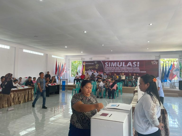 Manadoline.com, Sangihe- Simulasi Pemungutan dan Penghitungan Suara dalam rangka mempersiapkan Pemilihan Gubernur dan Wakil Gubernur Sulawesi Utara serta Bupati dan Wakil Bupati Kepulauan Sangihe Tahun 2024, digelar Komisi Pemilihan Umum Kabupaten Kepulauan Sangihe.