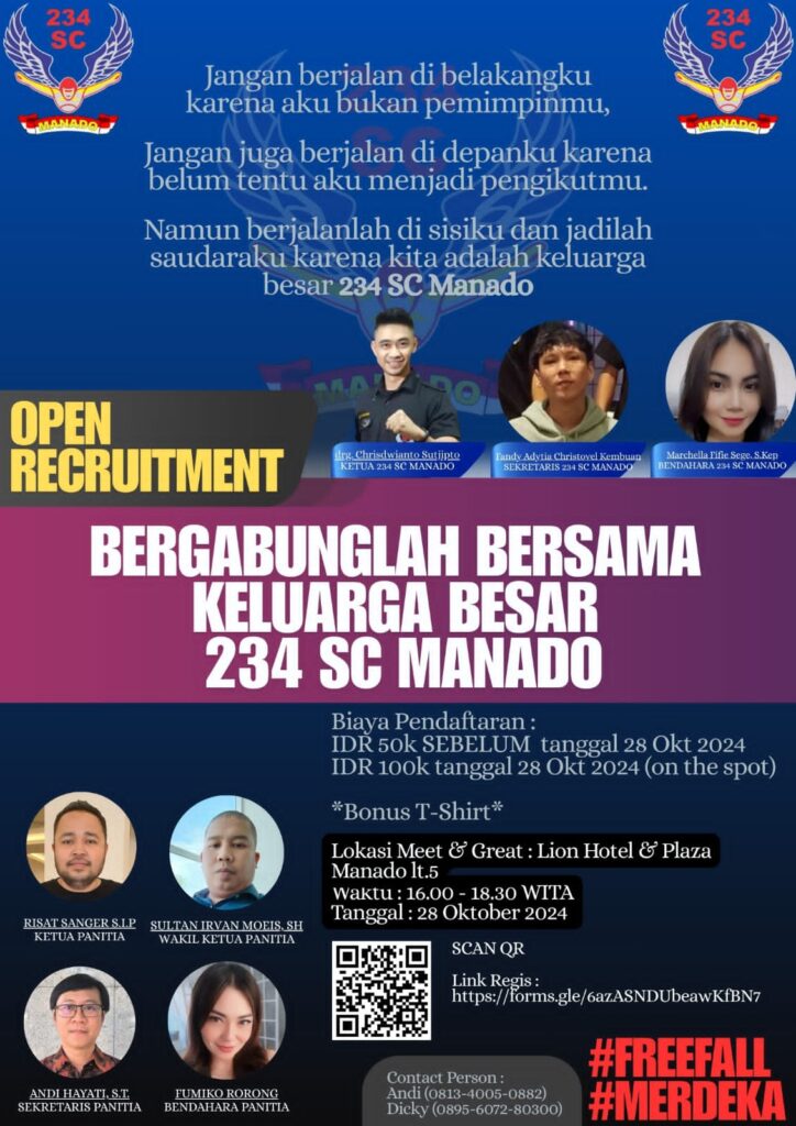 MANADO – Organisasi Masyarakat 234 SC Manado mengajak semua lapisan masyarakat yang memiliki kepedulian terhadap berbagai perkembangan dinamika berbagai sektor Pembangunan di Sulut untuk bergabung dalam keluarga Besar 234 SC Manado.