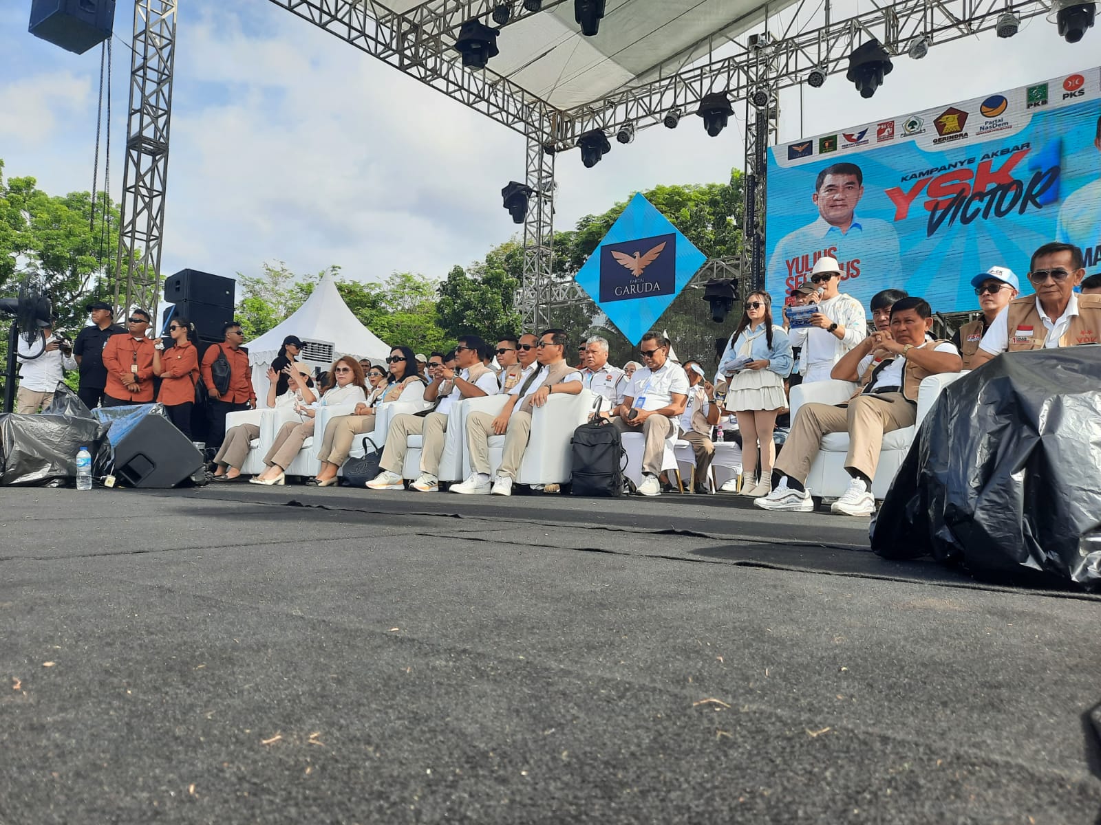 Terpantau ribuan massa pendukung antusias mendengar orasi politik YSK didampingi para pimpinan partai pengusung, yakni partai Gerindra, Golkar, NasDem, PAN, PPP, PSI, Perindo, PKS, PKB, Prima, PBB dan Partai Garuda. Sesekali para pendukung meneriaki yel…. yel… yel untuk kemenangan YSK-Victor di Pilkada Sulut 27 November nanti.