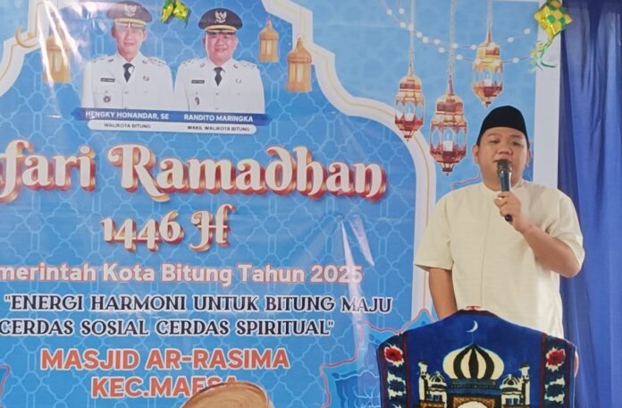 MAESA —Wakil Wali Kota Bitung Randito Maringka, menghadiri safari Ramadhan di masjid Al-Rashima Kelurahan Pateten Tiga Kecamatan Maesa, Sabtu (15/03/25).