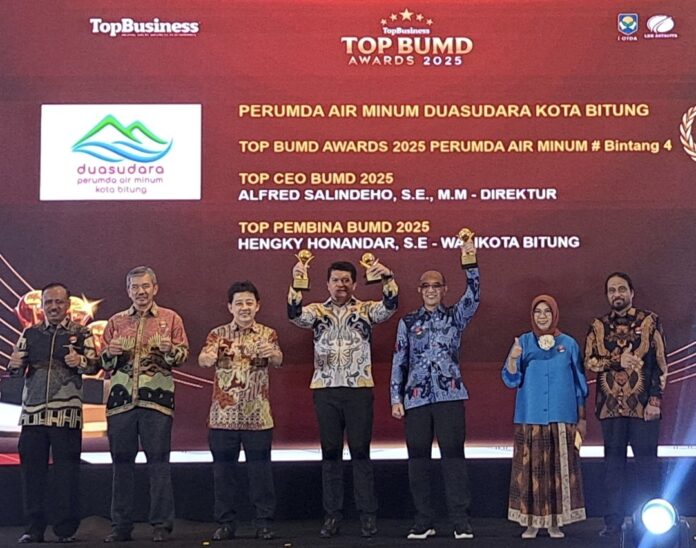 Hal itu diperoleh bersamaan dengan penghargaan yang diraih Wali Kota Bitung Hengky Honandar SE, sebagai Top Pembina Badan Usaha Milik Negara (BUMD) Awards 2025 se-Indonesia, serta Direktur Perumda Duasudara Bitung Sir Alfred Salindeho SE MM juga dinobatkan sebagai Top CEO BUMD oleh Top Businness.