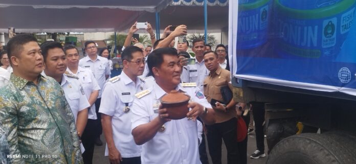 BITUNG —Wali Kota Hengky Honandar bersama Wakil Wali Kota Bitung, Randito Maringka mendampingi Gubernur Sulawesi Utara (Sulut), Yulius Selvanus Komaling saat melepas ekspor perdana produk Tuna Ramah Lingkungan Pole and Line – MSC- Fair Trade sebanyak 25 ton milik PT. Samudera Mandiri Sentosa (SMS) Bitung. Pada, Rabu (4/6/2025).