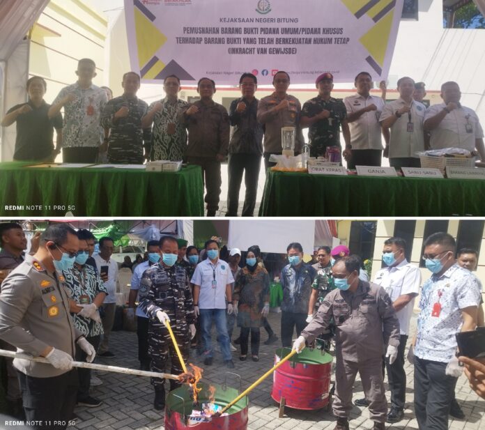 BITUNG —Kejaksaan Negeri (Kejari) Bitung menggelar kegiatan pemusnahan barang bukti dari 26 perkara yang telah memiliki hukum tetap yng dilaksanakan pada Kamis (26/6/2025) di halaman kantor Kejari Bitung.