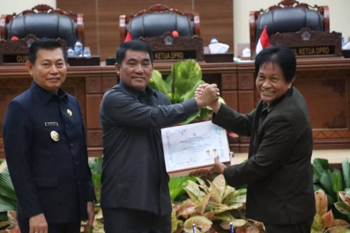 Gubernur Sulut Mayjen TNI (Purn) Yulius Selvanus saat menerima dokumen Ranperda Pertanggungjawaban APBD tahun Anggaran 2024 dari Ketua Dewan Fransiscus A Silangen.