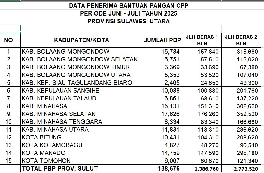 Menurut Plt. Kadis Ketahanan Pangan Sulut, Franky Tintingon, bantuan pangan beras ini adalah program pemerintah pusat berupa penyaluran beras yang bersumber dari stok Cadangan Beras Pemerintah Pusat yang dikelola Perum Bulog dan disalurkan ke daerah atau kelurahan atau desa yang menerima bantuan.