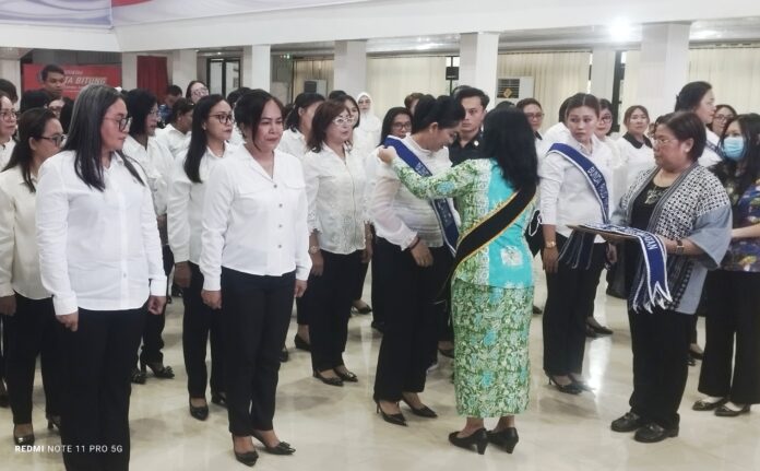 BITUNG —Bunda PAUD Kota Bitung, Ny. Ellen Honandar Sondakh SE, didampingi Sekretaris TP PKK, Ny Jacinta Marybell Maringka Gumolung, mengukuhkan Bunda PAUD Kecamatan dan Kelurahan se-Kota Bitung yang dilaksanakan di ruang SH Sarundajang, Kamis (17/7/2025).