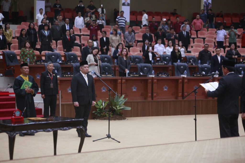 MANADO-Ketua DPRD Sulut Fransiscus Andi Silangen, Jumat (25/7/2024) memimpin Rapat Paripurna dengan agenda pelantikan antar waktu anggota DPRD Sulut, Raski Azhari Mokodompit.