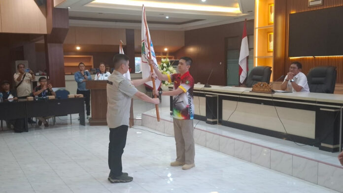 Terpilihnya Ketua Perbakin Kota Bitung, ditandai dengan penyerahan Bendera Pataka Perbakin oleh Ketua Harian Perbakin Sulut dr Galvin Mongi kepada Ketua Perbakin Bitung dr Fransiskus Silvester Raymond Galag. (fka).