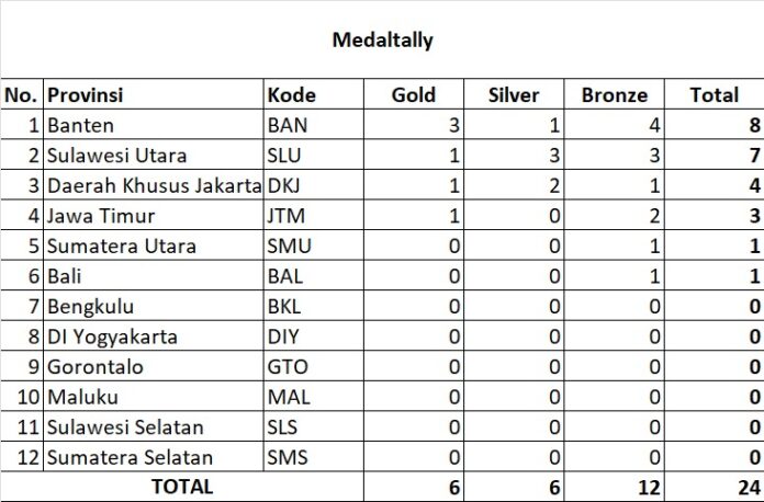 Sementara itu, kontingen Sumatera Utara, Bali, dan Bengkulu masing-masing membawa pulang satu medali perunggu, menempatkan mereka di papan bawah klasemen.