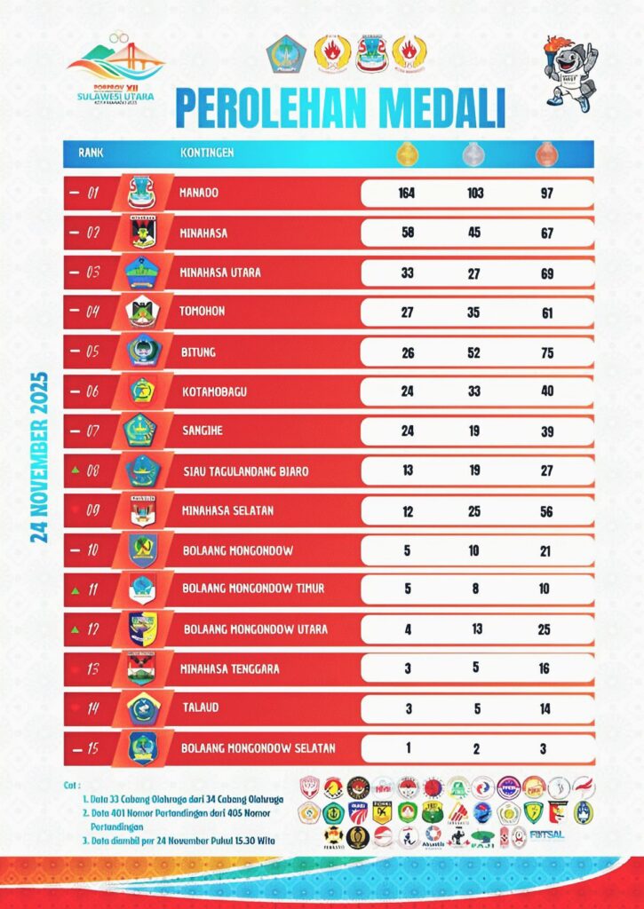 Sementara itu, Ketua Panitia Porprov XII, Wakil Wali Kota Manado dr. Richard Sualang, melaporkan bahwa Porprov 2025 mempertandingkan 34 cabang olahraga dengan 402 nomor terlaksana dari 405 nomor yang dijadwalkan. Ia mengapresiasi kerja keras seluruh pihak yang terlibat.