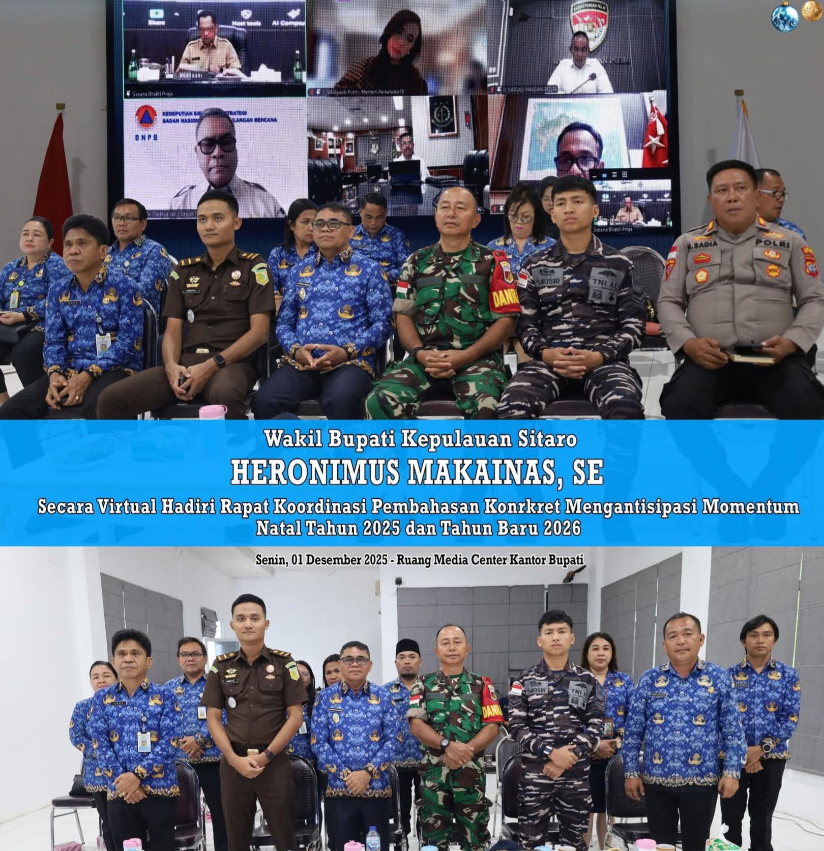 Sitaro,- Rapat Koordinasi Pembahasan Konkrit Mengantisipasi Momentum Natal dan Tahun Baru (Nataru) 2026 resmi digelar oleh Kementerian Dalam Negeri sebagai bentuk kesiapan nasional menghadapi puncak mobilitas akhir tahun. Senin (01/12/2025).