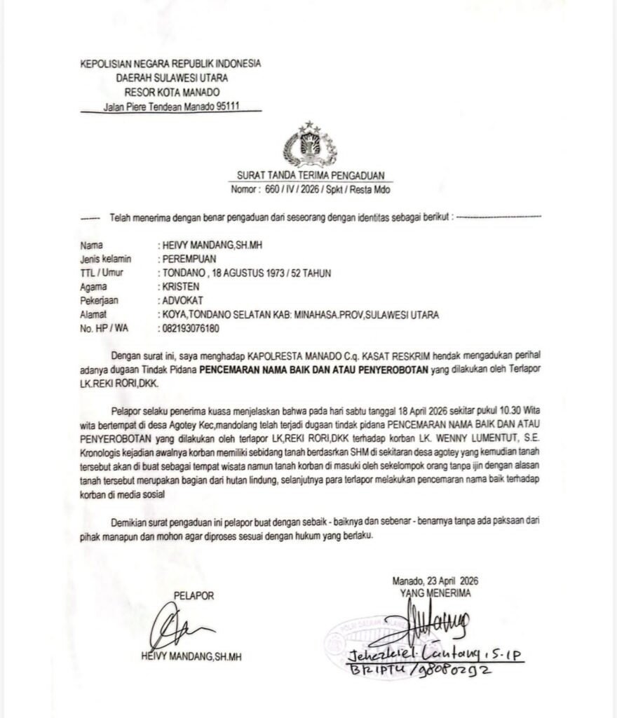 MINAHASA-Pemilik lahan di kawasan Gunung Tatawiran, Desa Agotey, Kecamatan Mandolang, Kabupaten Minahasa, Sulawesi Utara, Wenny Lumentut, akhirnya menempuh jalur hukum dengan melaporkan beberapa oknum bakal calon hukum tua ke pihak kepolisian, tepatnya di Polresta Manado, Kamis (23/4/2026) siang, atas dugaan provokasi dan pencemaran nama baik.
