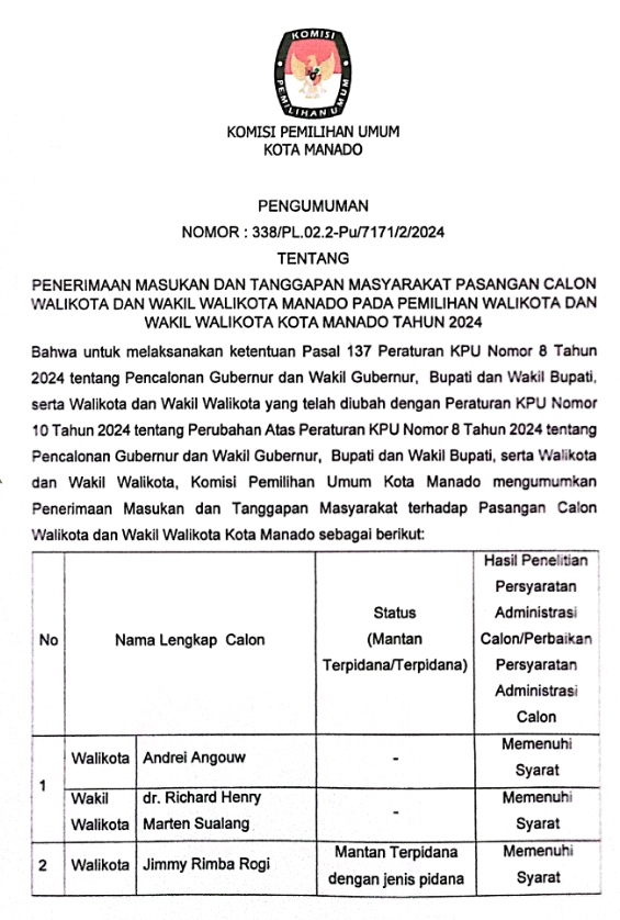 KPU Umumkan Pendaftaran Paslon Wali Kota & Wakil Wali Kota Manado 2024, Ini Syarat Minimal Suara Sah